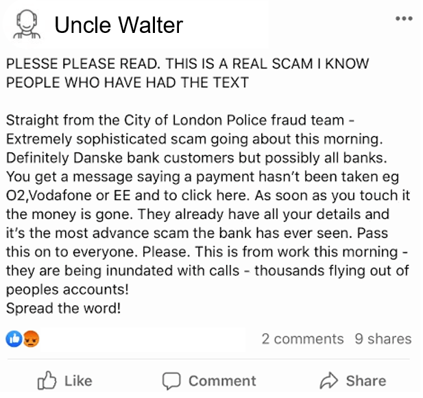 And as you scroll, there it is again: Your uncle has put the meme into the local community Facebook Group that you’re both in. Surely he must have seen the comment on the previous posts. Even other people are commenting on those posts now, mostly agreeing with you that phishing scams don’t work as described in the meme.
