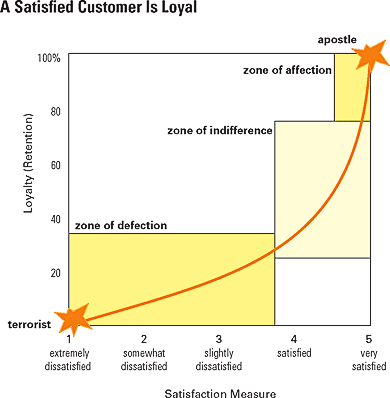 James Heskett of the Harvard Business School developed a theory which was published in the Harvard Business Review under the title Putting the Service-Profit Chain to Work. Heskett explains that customer satisfaction will lead to a loyal customer and, following from data from customer satisfaction surveys, customers can be put into three different zones: The Zone of Affection, The Zone of Indifference, and The Zone of Defection. The two extremes of the customer are: The Apostle and The Terrorist.